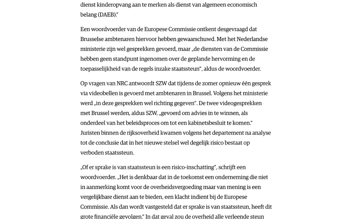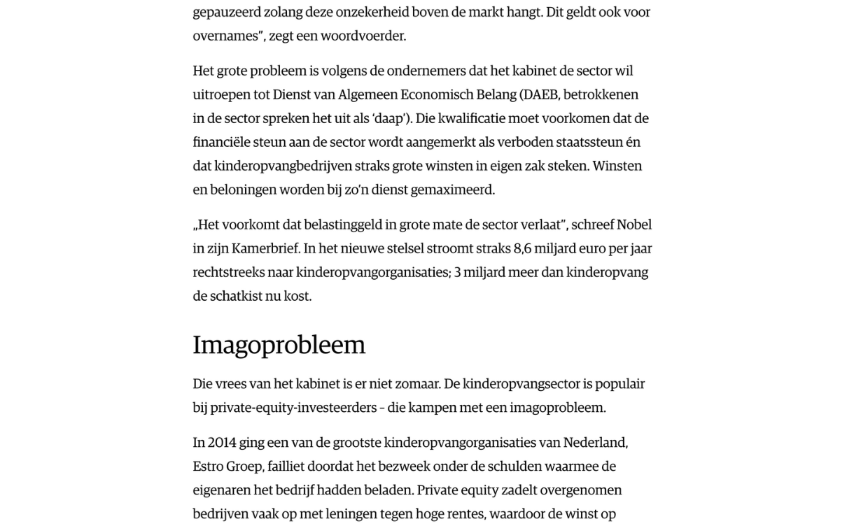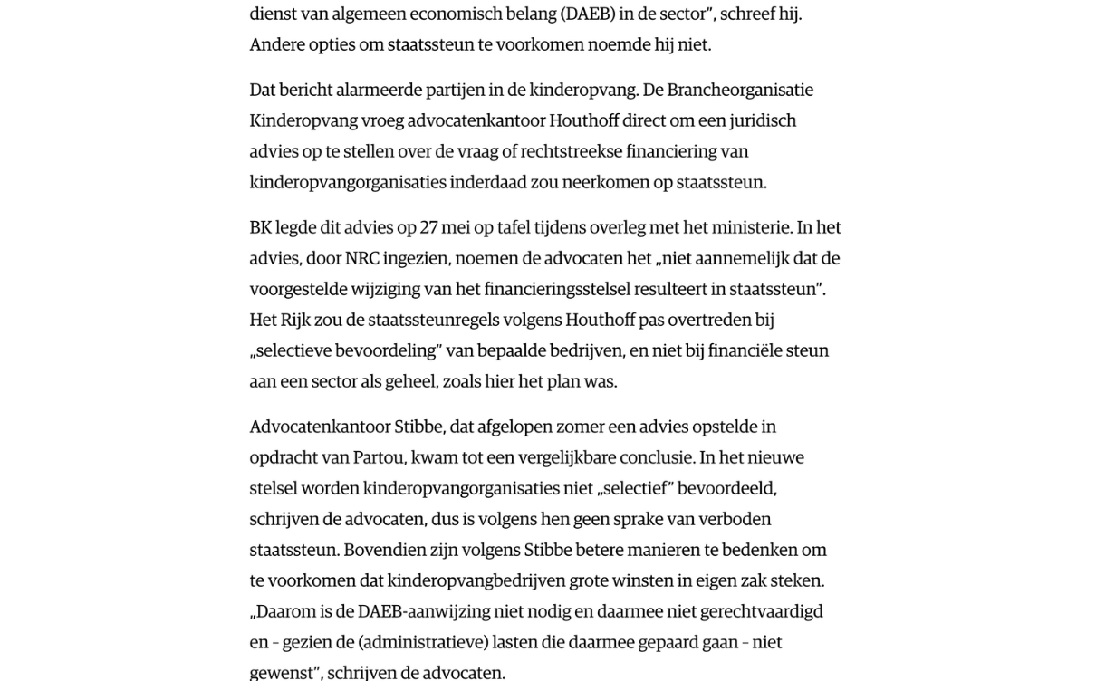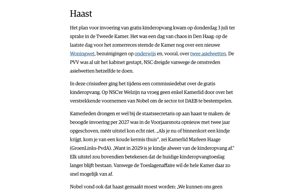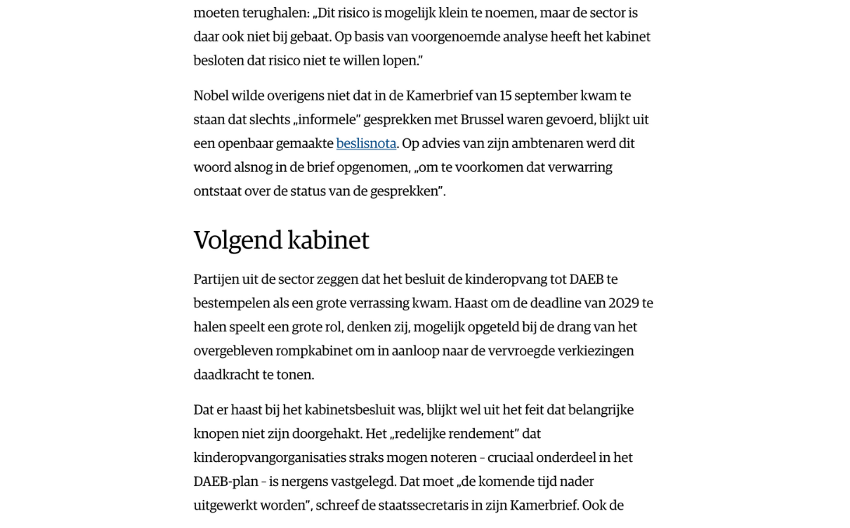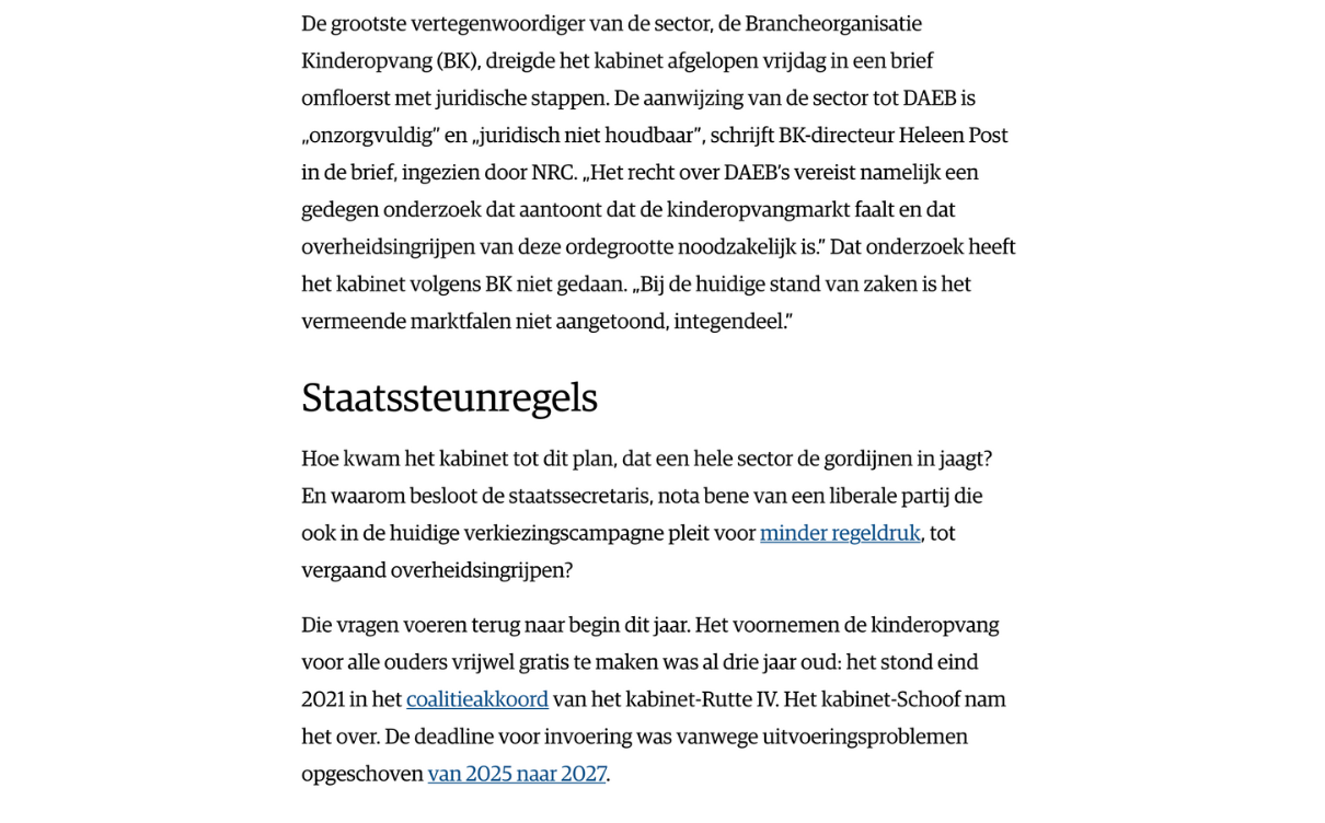 Volgens NRC dreigt het kabinet op ramkoers te raken met de kinderopvangsector. De plannen om de opvang “bijna gratis” te maken vanaf 2029 brengen grote veranderingen met zich mee — van strengere regels voor winst en ondernemerschap tot mogelijke beperkingen voor particuliere organisaties.