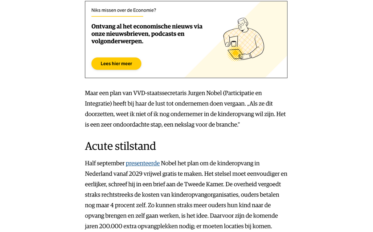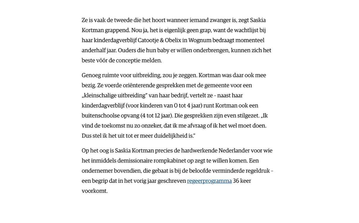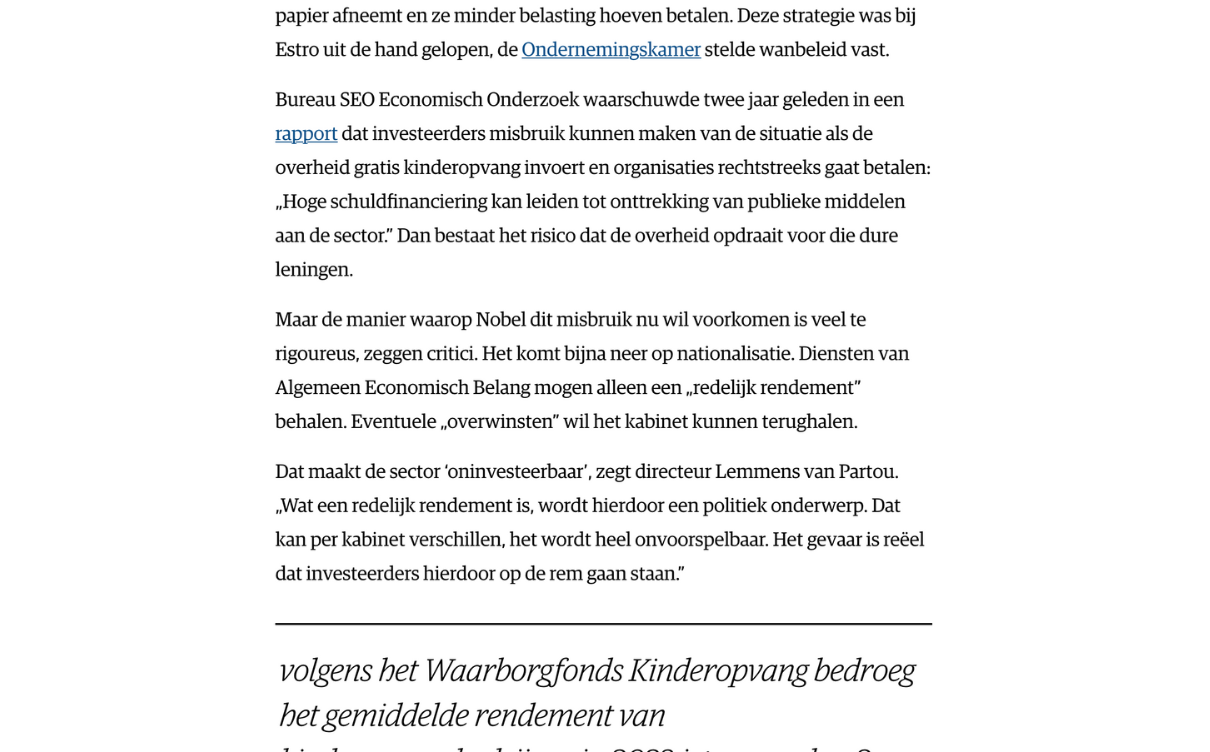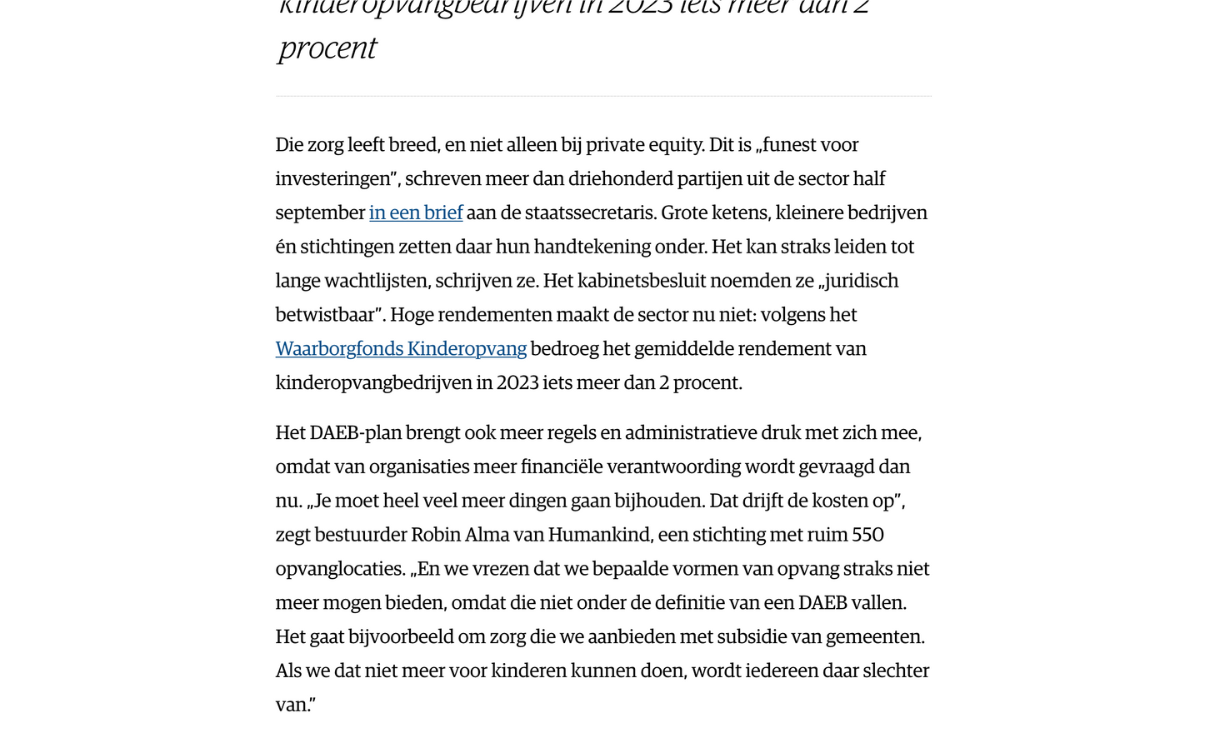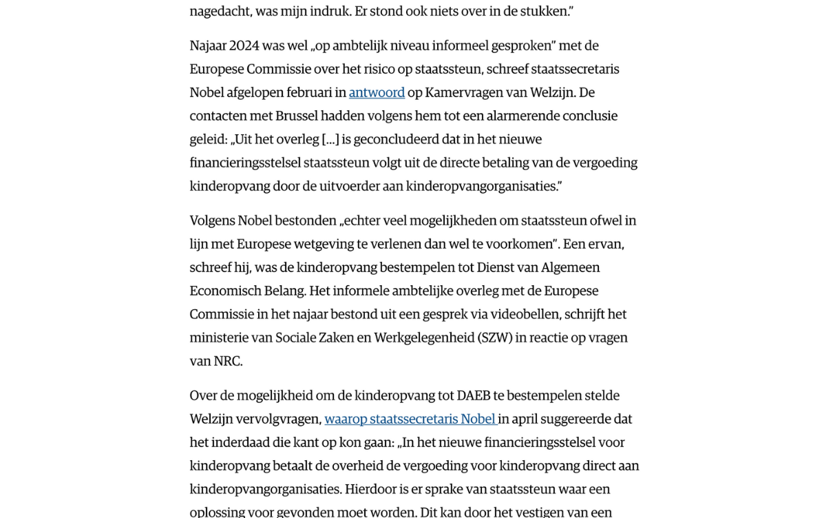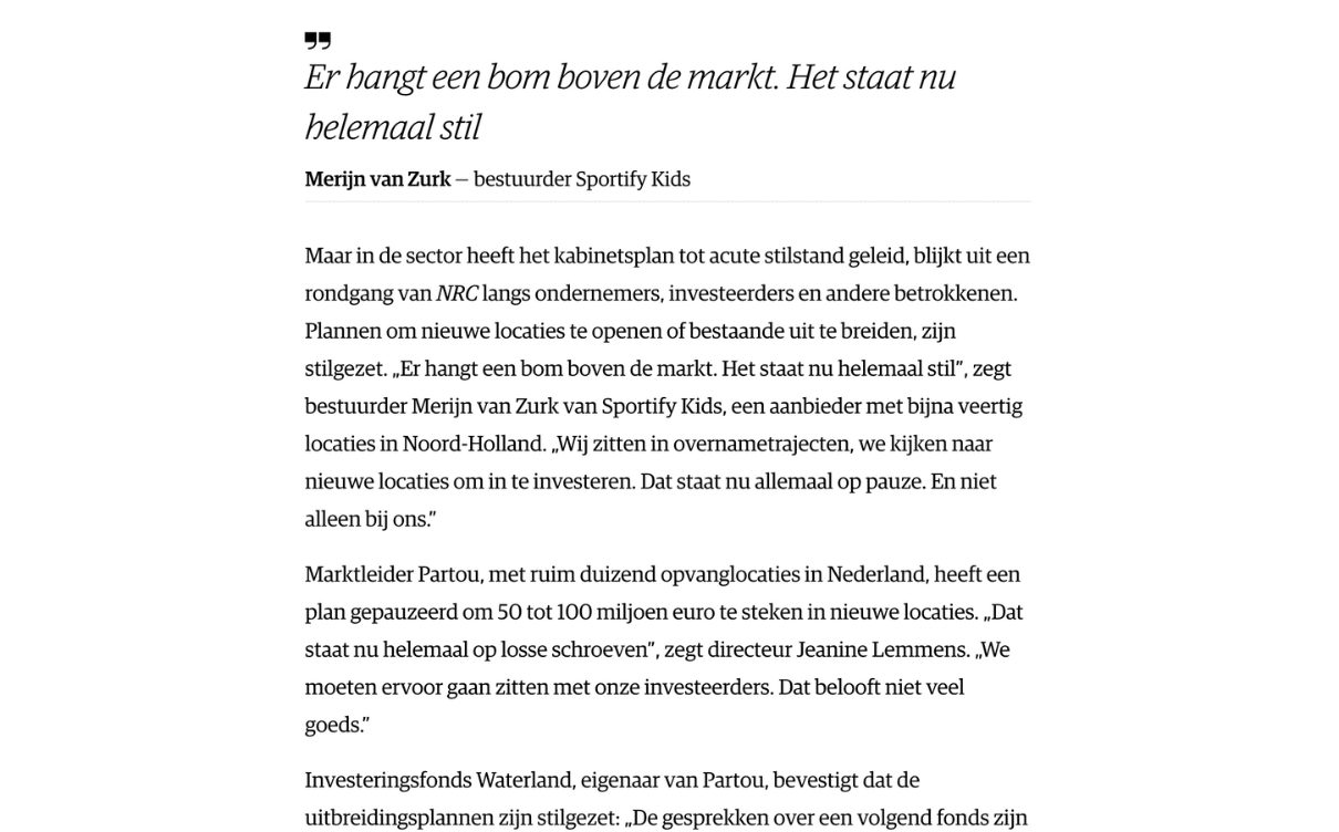 Volgens NRC dreigt het kabinet op ramkoers te raken met de kinderopvangsector. De plannen om de opvang “bijna gratis” te maken vanaf 2029 brengen grote veranderingen met zich mee — van strengere regels voor winst en ondernemerschap tot mogelijke beperkingen voor particuliere organisaties.